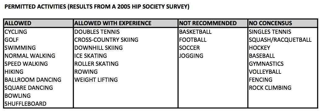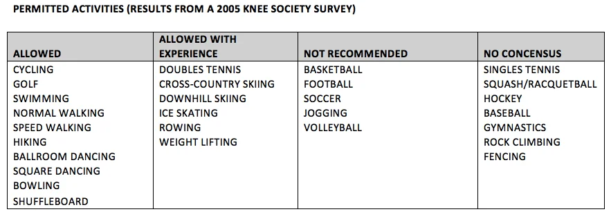 Lets look at the risks of these activities and the current recommendations made by the Knee Society and the American Hip Society. [1] The concern for over-activity is the risk of accelerated wear of the joint replacement, as well as risk of falls and subsequent prosethesis loosening or periprosthetic fracture[2, 3].