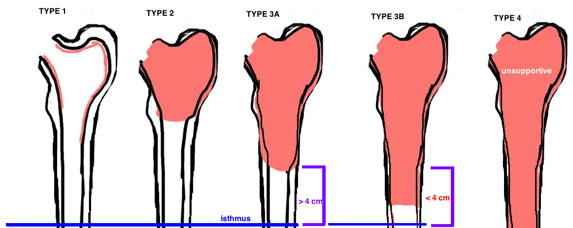 Proxmially coated stems (primary implants) can be used if sufficient metaphyseal bone stock for ingrowth. Fully-coated stems (cylindrical monoblock) are used for deficient metaphyseal bone stock but decent diaphyseal bone (type 2, type 3A), however, there were high failure rates if used in cases with notable deficiency in diaphyseal bone stock. Fluted, Tapered Stems (Wagner-type) either monoblock or modular are successful for type 3B, and some type 4. Modular Wagner-type stems have grown in popularity because adjustments can be made if the final implant subsides more than the trial implant. Oncology prosthesis are often needed in type 4 implants when the bone stock is deficient past the isthmus of the femur.